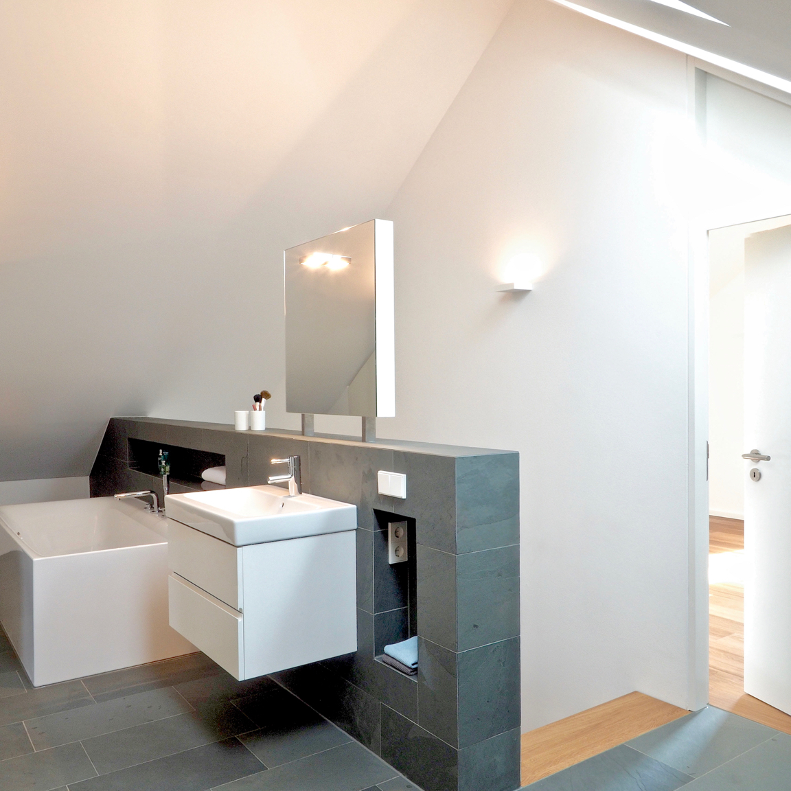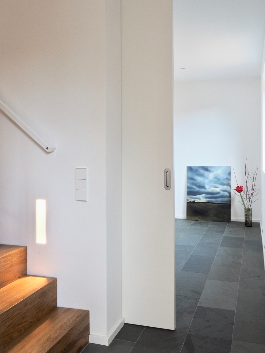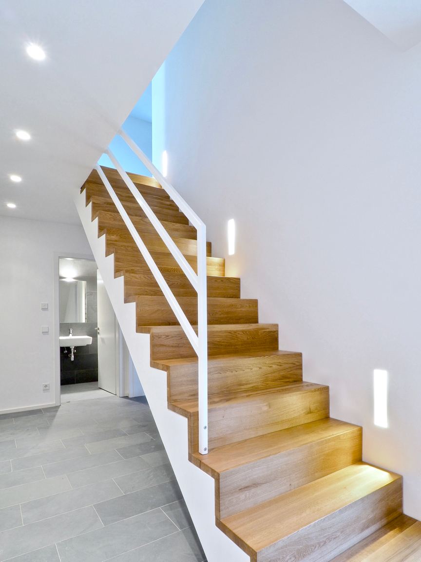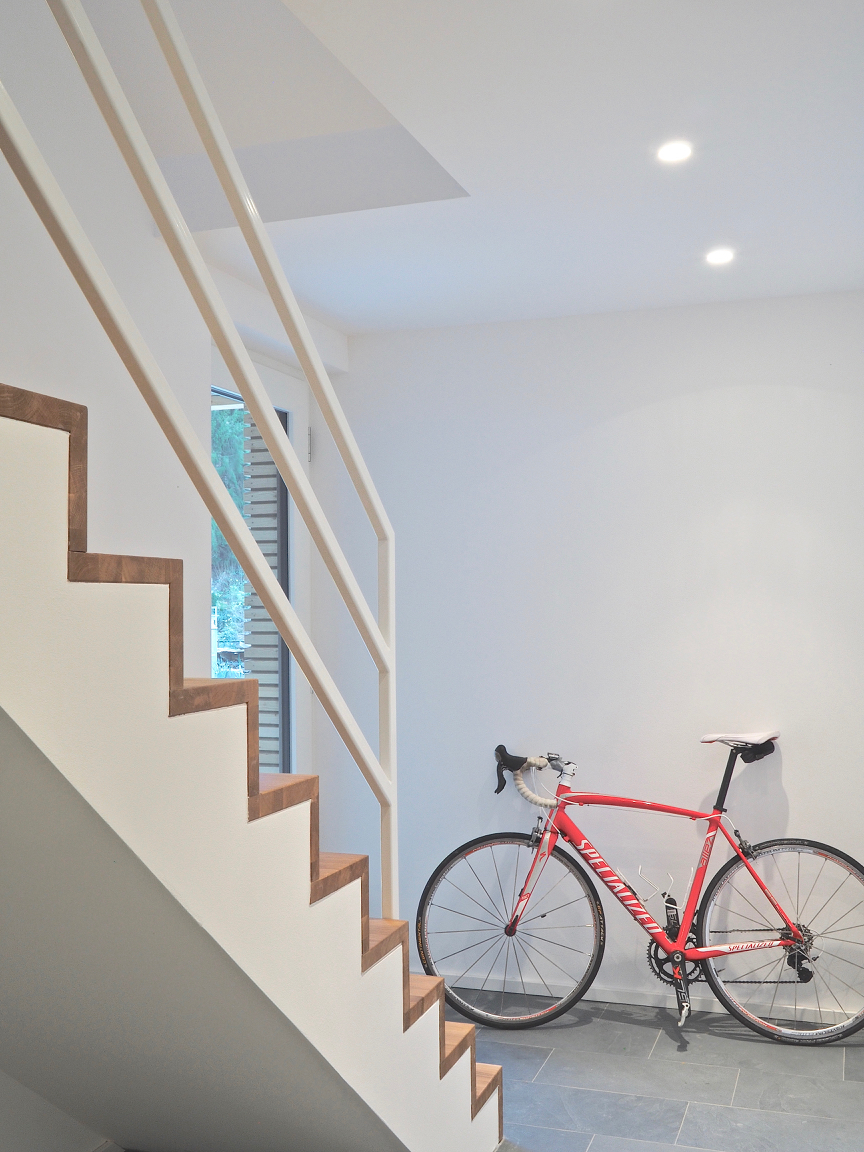 Ein Neubau, an einem steilen Hang, für ein Ehepaar mit einem passionierten Radfahrer. Der Ort liegt gut gelegen für schöne Touren in den kleinen Odenwald. Innen verbinden gerade Treppen die Geschosse. Im Dach befindet sich ein offener Bad-Sauna Bereich.