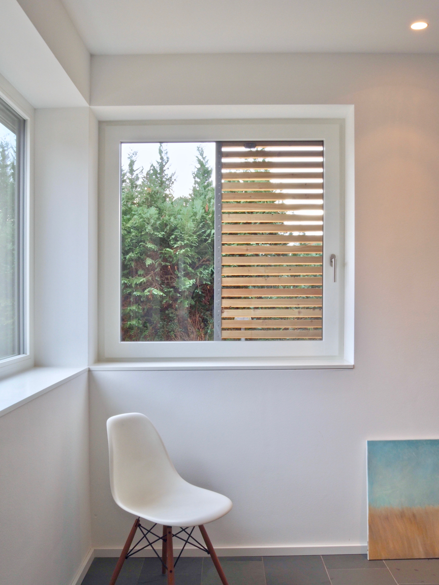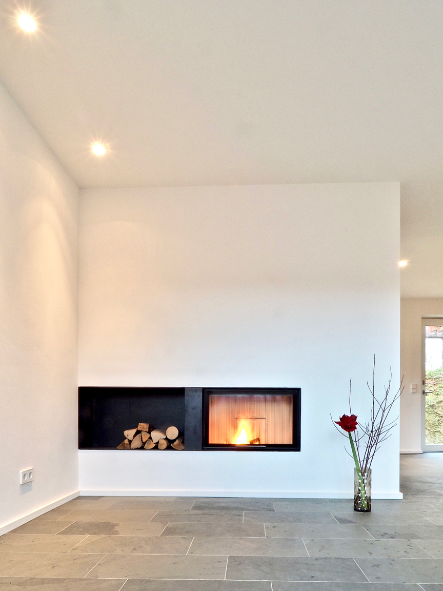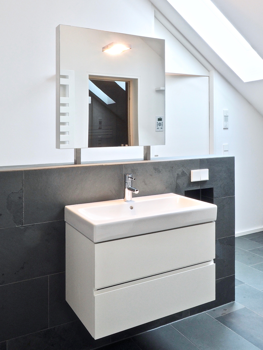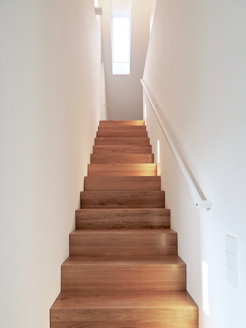 Ein Neubau, an einem steilen Hang, für ein Ehepaar mit einem passionierten Radfahrer. Der Ort liegt gut gelegen für schöne Touren in den kleinen Odenwald. Innen verbinden gerade Treppen die Geschosse. Im Dach befindet sich ein offener Bad-Sauna Bereich.