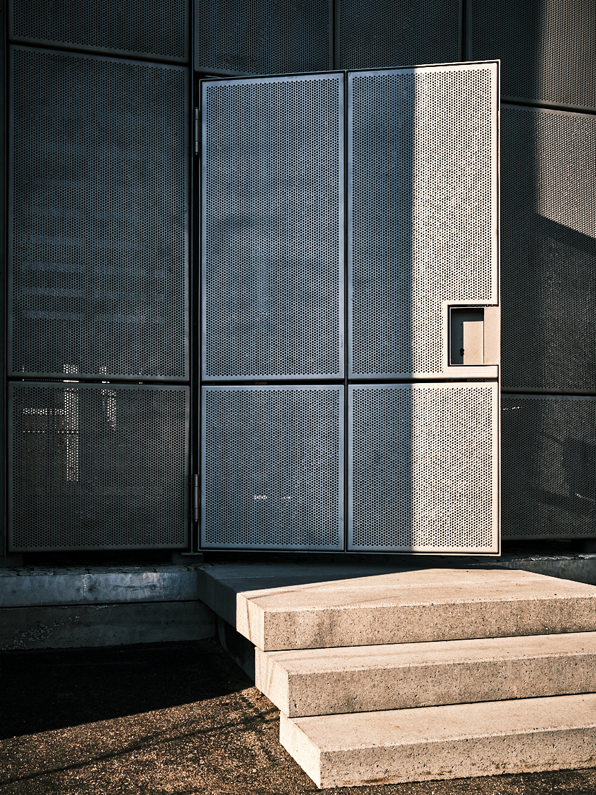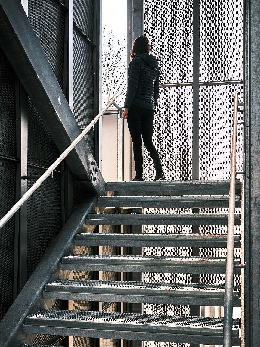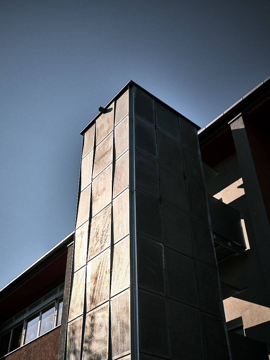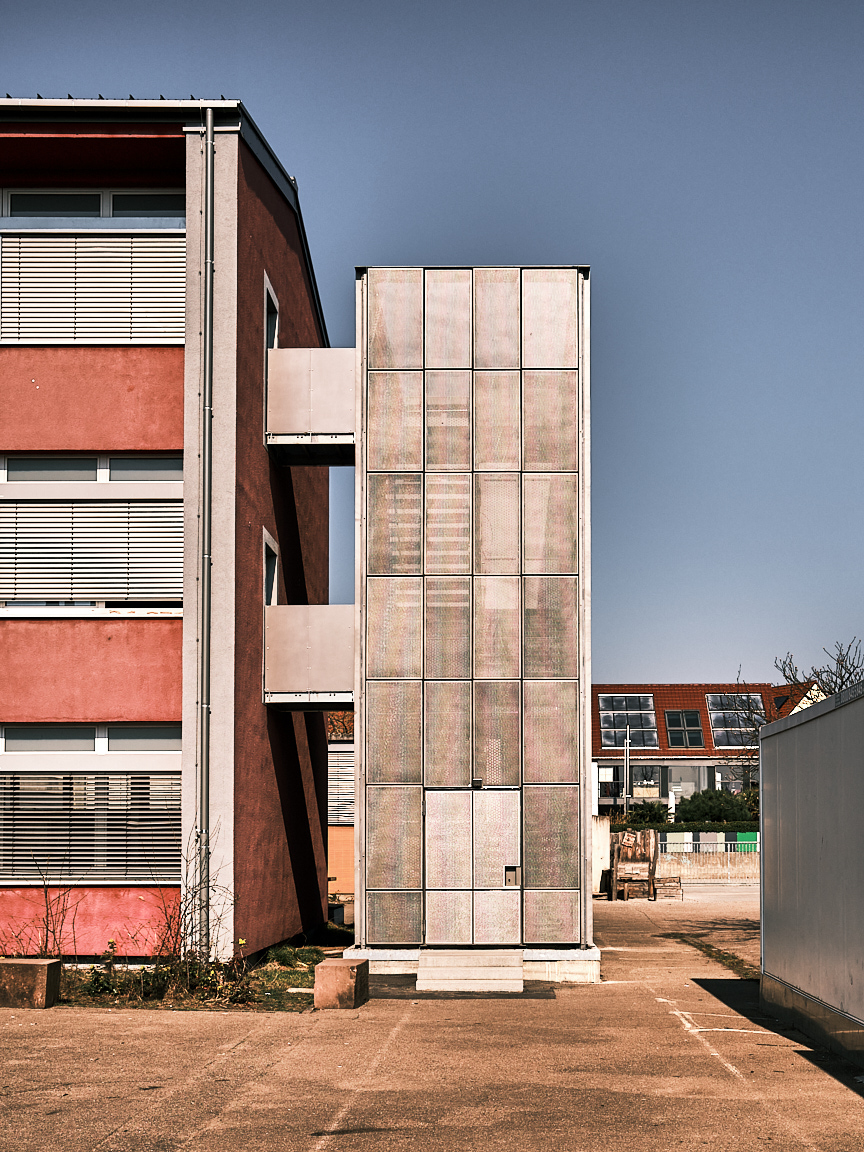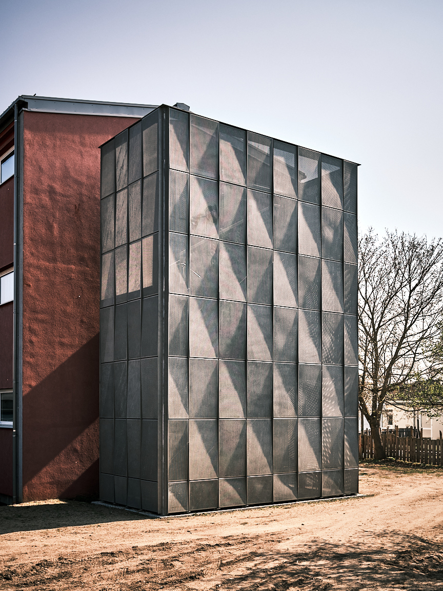 Da der dreigeschossige Gebäudeteil der Schule im Brandfall keine sicheren inneren Treppen besaß, wurden zwei neue Treppentürme an den Giebelfassaden des Bestandsgebäudes errichtet. Die Türme sind als eigenständige Gebäude, mit kleinen Brücken zu den Klassenräumen entwickelt. Die Fassade, aus leicht geneigten Lochblechen, dient gleichzeitg als Absturzsicherung. Für kurze Momente an sonnigen Tagen ist ein beeindruckendes Schattenspiel an den Fassaden der Türme zu beobachten. Ähnlich den Treppentürmen wurde ein Aufzugsturm für die barrierefreie Erschließung des Gebäudes konzipiert.