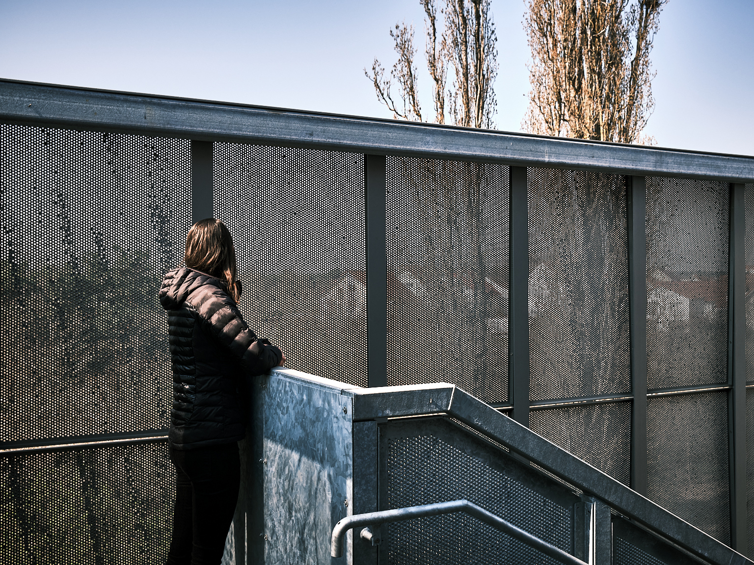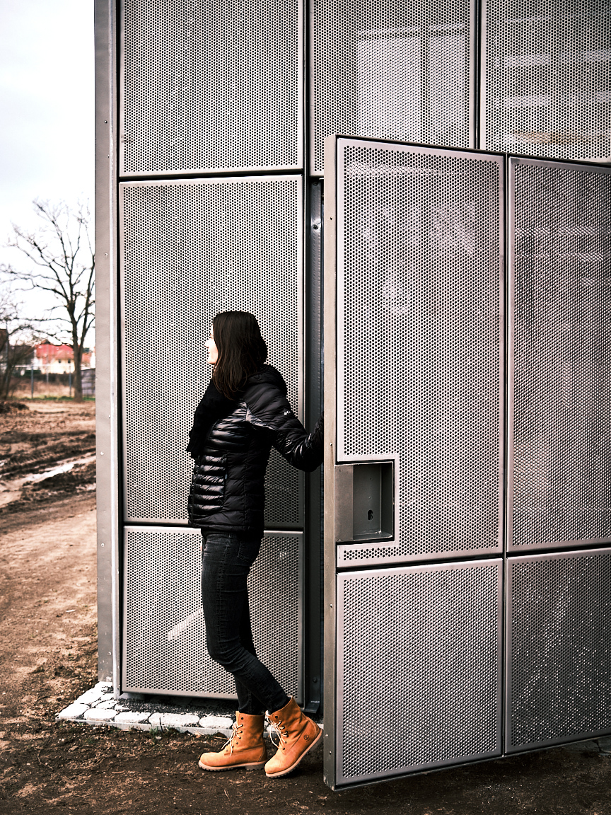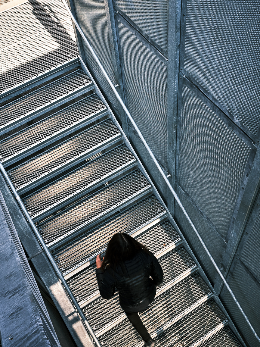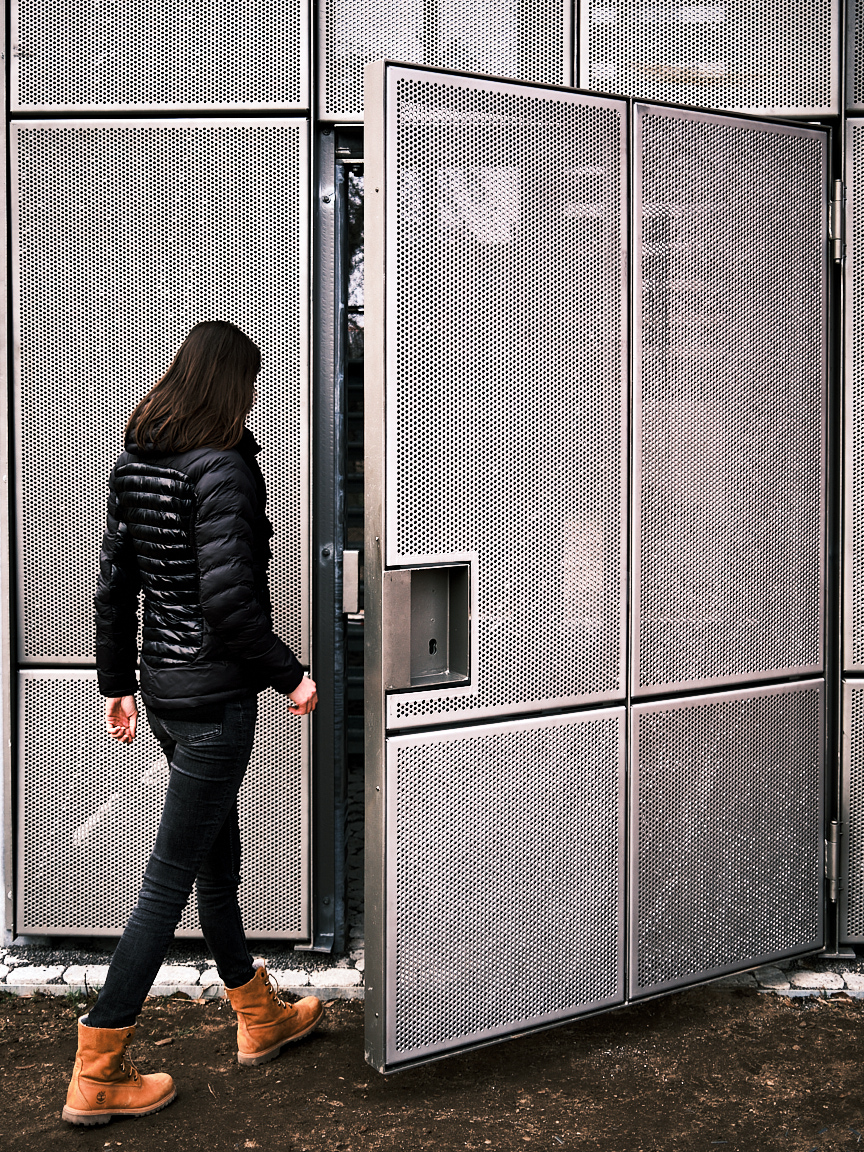 Da der dreigeschossige Gebäudeteil der Schule im Brandfall keine sicheren inneren Treppen besaß, wurden zwei neue Treppentürme an den Giebelfassaden des Bestandsgebäudes errichtet. Die Türme sind als eigenständige Gebäude, mit kleinen Brücken zu den Klassenräumen entwickelt. Die Fassade, aus leicht geneigten Lochblechen, dient gleichzeitg als Absturzsicherung. Für kurze Momente an sonnigen Tagen ist ein beeindruckendes Schattenspiel an den Fassaden der Türme zu beobachten. Ähnlich den Treppentürmen wurde ein Aufzugsturm für die barrierefreie Erschließung des Gebäudes konzipiert.