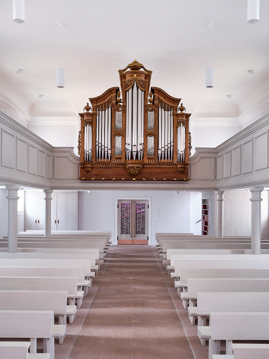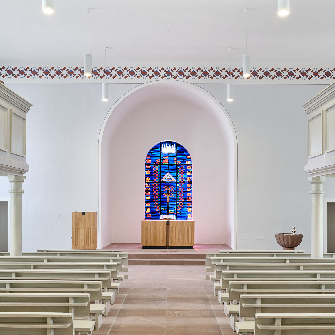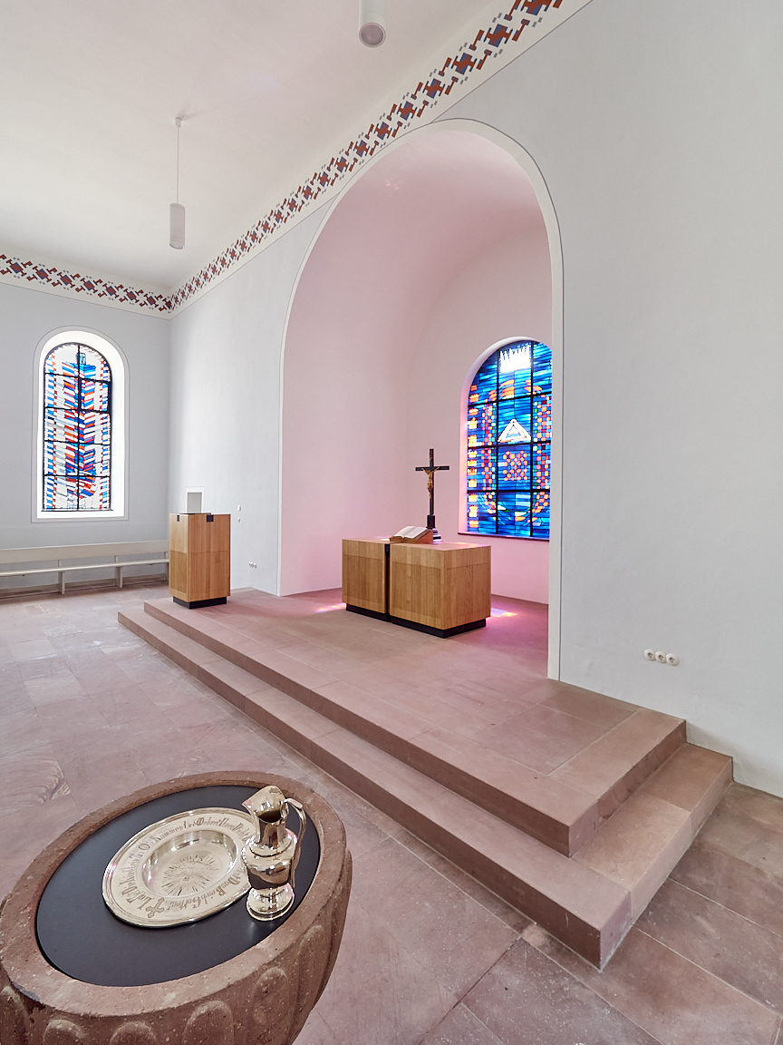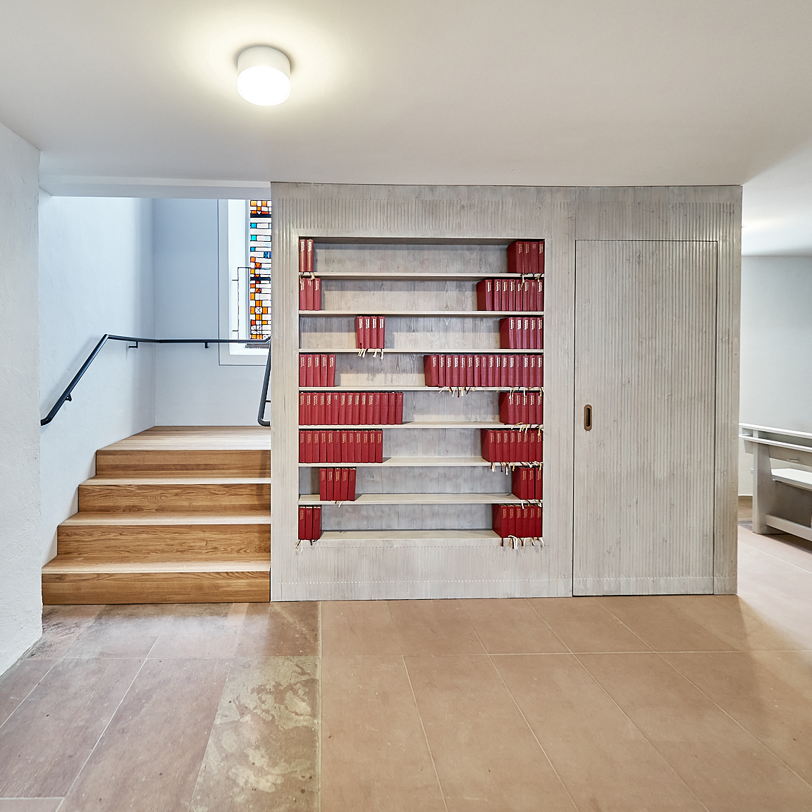 Hier wurden neben der Eneuerung der Haustechnik, sämtliche Oberflächen überplant. Bei der Haustechnik wurde die alte Luftheizung gegen eine Fußbodenheizung mit Erdwärme ausgetauscht, die neue Beleuchtung lässt variable Szenarien und Lichtstimmungen zu. Im hinteren Kirchenteil wurde der Zugang zur Empore optimiert, ein neuer Lagerraum nimmt u. a. die Gesangsbücher auf. Ein Schrank fasst die ganzen Steuerelemente der Technik. Der Altarbereich wurde um eine Stufe abgesenkt, die Prinzipalien in Abstimmung mit dem vorhandenen Taufbecken neu entwickelt. Auch die Sakristei und ein WC mit Vorraum erhielten eine neue Möblierung.