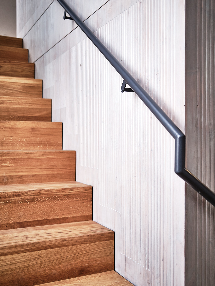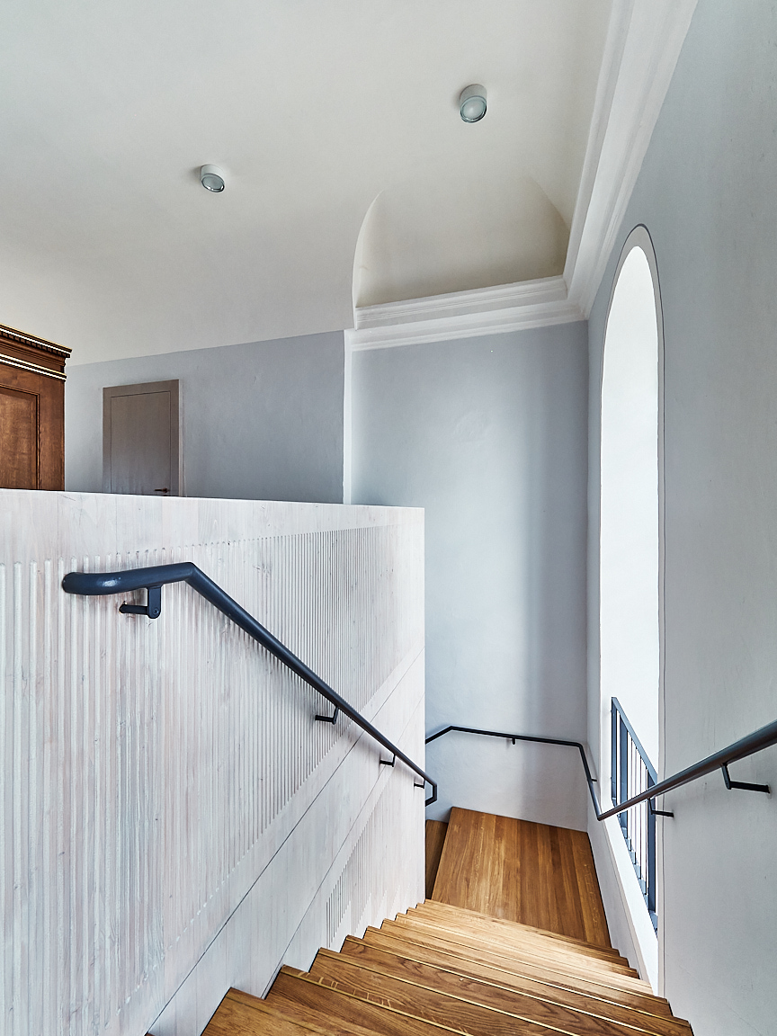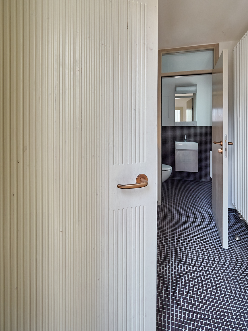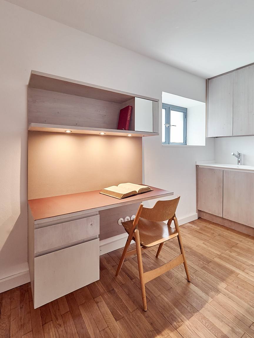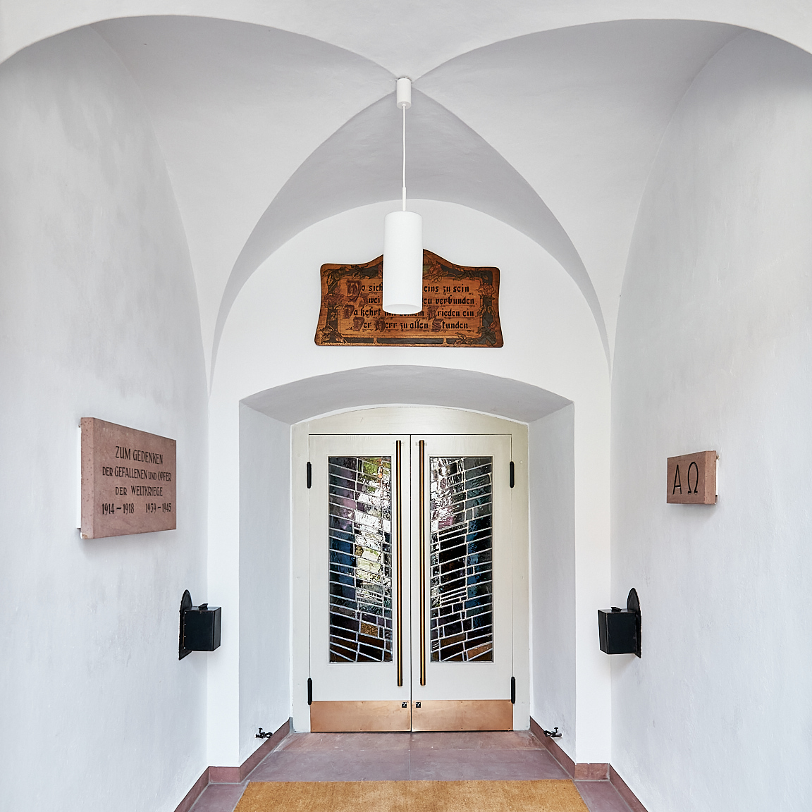 Hier wurden neben der Eneuerung der Haustechnik, sämtliche Oberflächen überplant. Bei der Haustechnik wurde die alte Luftheizung gegen eine Fußbodenheizung mit Erdwärme ausgetauscht, die neue Beleuchtung lässt variable Szenarien und Lichtstimmungen zu. Im hinteren Kirchenteil wurde der Zugang zur Empore optimiert, ein neuer Lagerraum nimmt u. a. die Gesangsbücher auf. Ein Schrank fasst die ganzen Steuerelemente der Technik. Der Altarbereich wurde um eine Stufe abgesenkt, die Prinzipalien in Abstimmung mit dem vorhandenen Taufbecken neu entwickelt. Auch die Sakristei und ein WC mit Vorraum erhielten eine neue Möblierung.