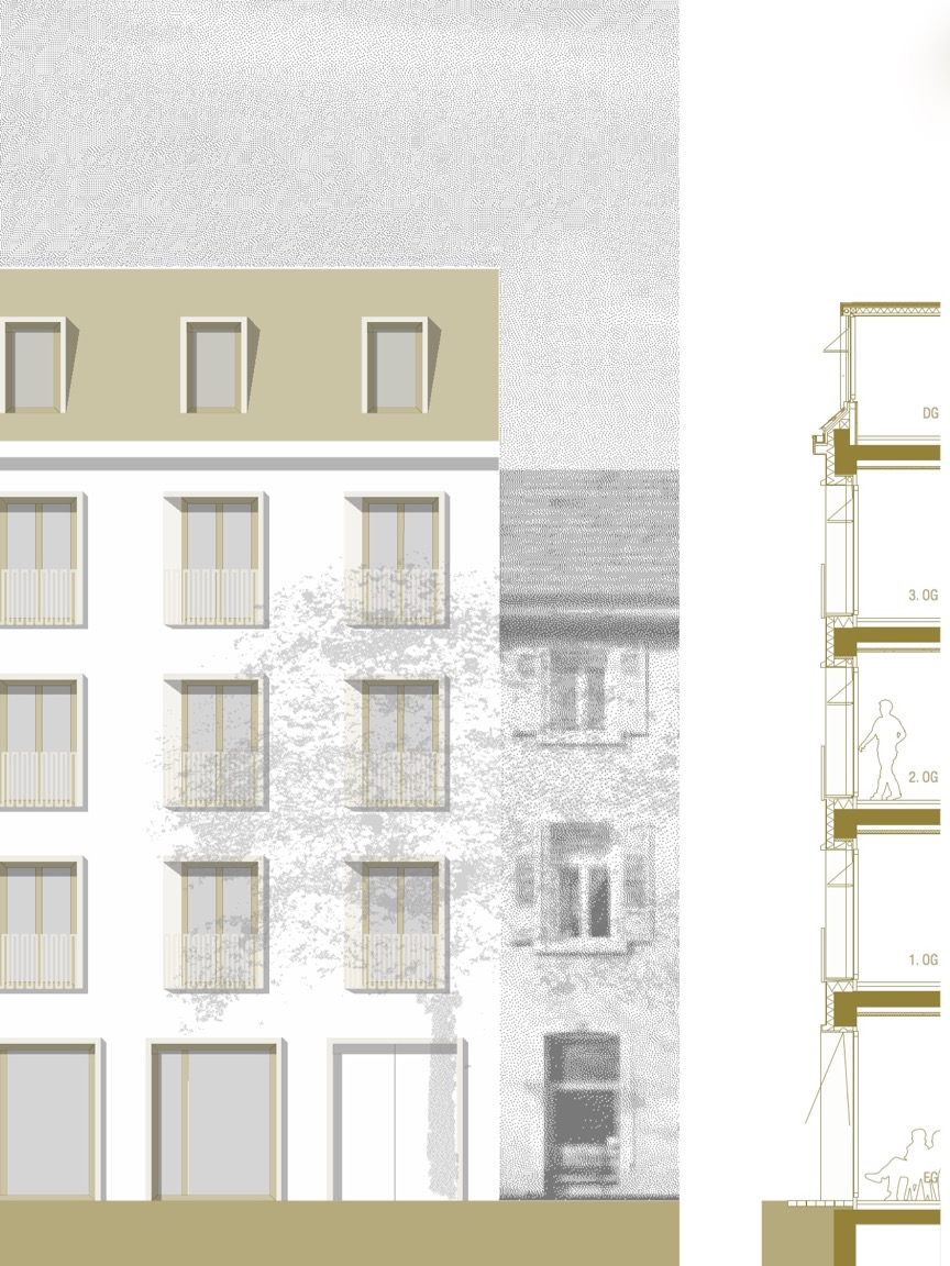 Bei der Entwicklung der sehr zurückhaltenden Fassade wurde als erste Priorität die städtebauliche Einfügung, nach dem
