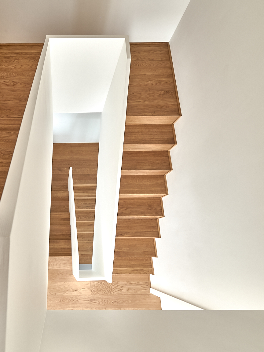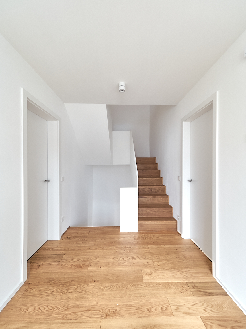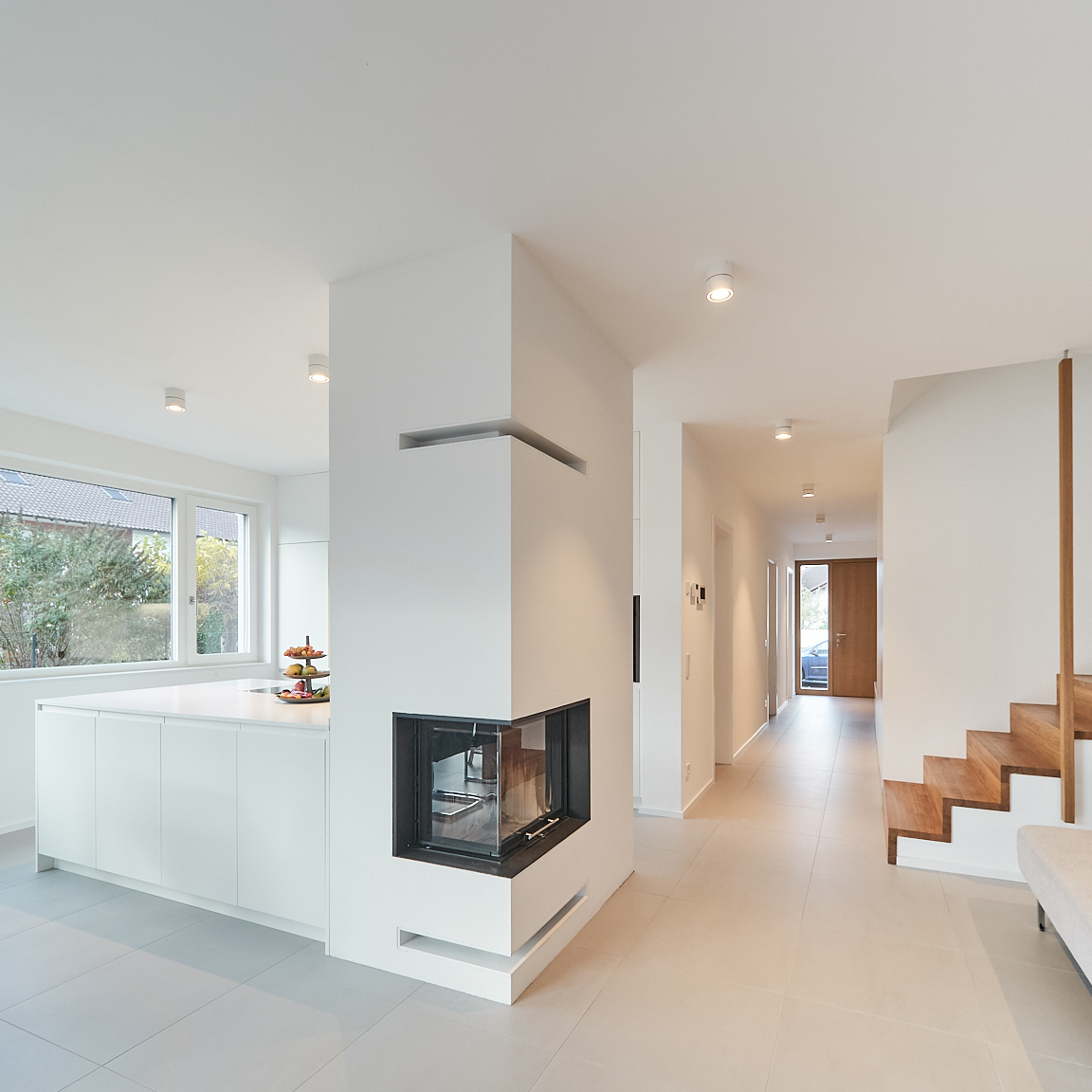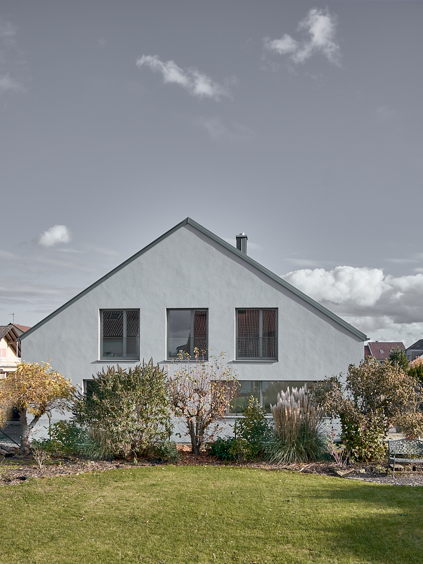 Der Neubau, eingeschossig mit Satteldach, fügt sich in die gebaute Umgebung aus den Neunzigerjahre ein. Das Haus wurde ohne Keller errichtet und dafür bis ins Dach ausgebaut. Die zentrale Treppe über drei Ebenen, bietet durch ein sich nach oben vergrösserndes Treppenauge, Blicke bis ins Dach. Im Erdgeschoss gliedert ein zentraler Kamin den offenen Koch-, Ess- und Wohnbereich. Im OG liegen um einen Spielflur die Schlafzimmer und das Bad. Unter dem Dachspitz ist noch Raum für ein Studio.