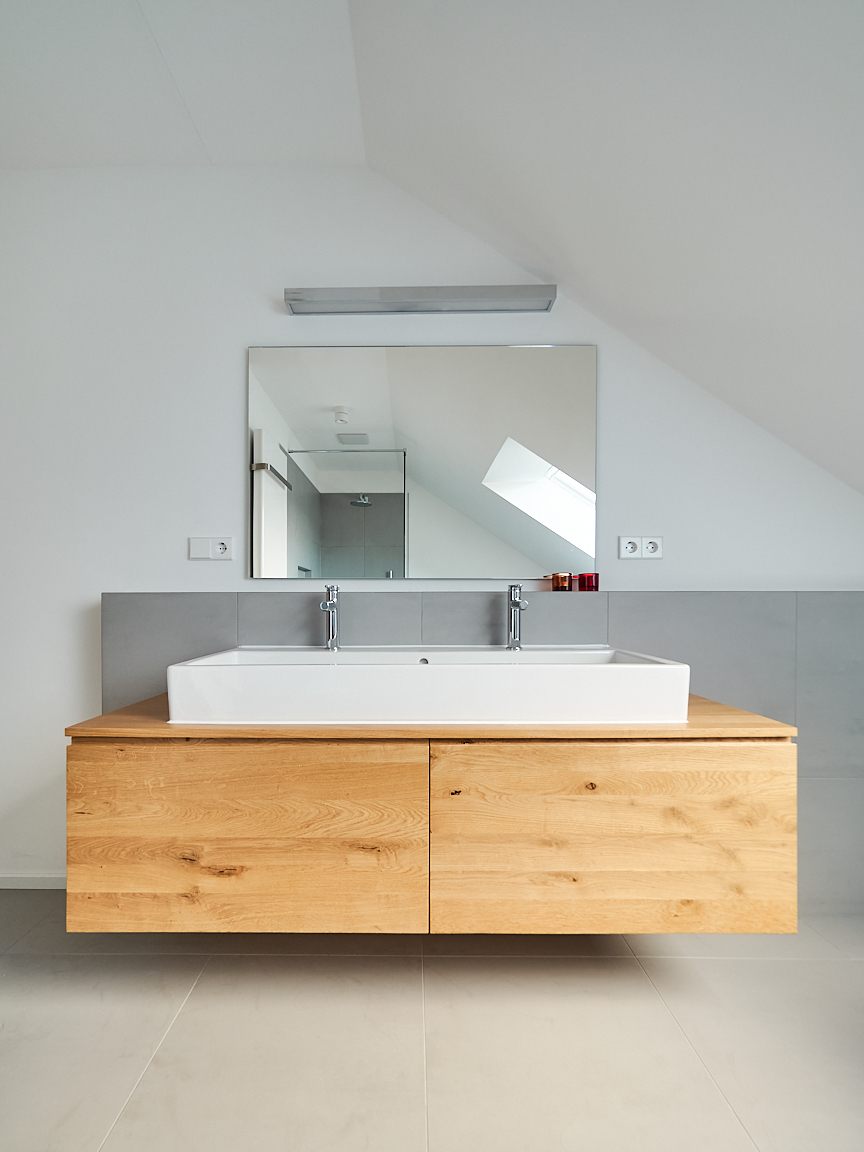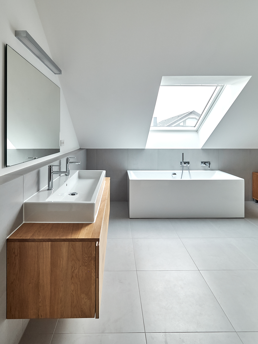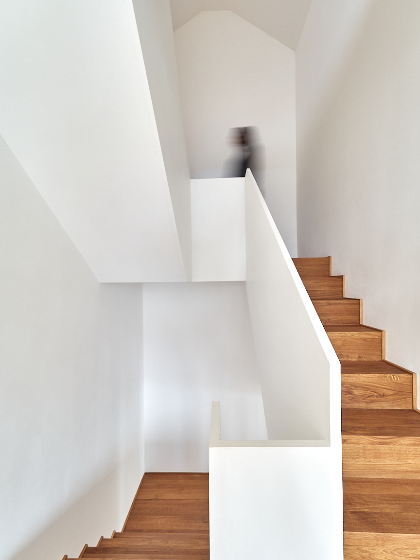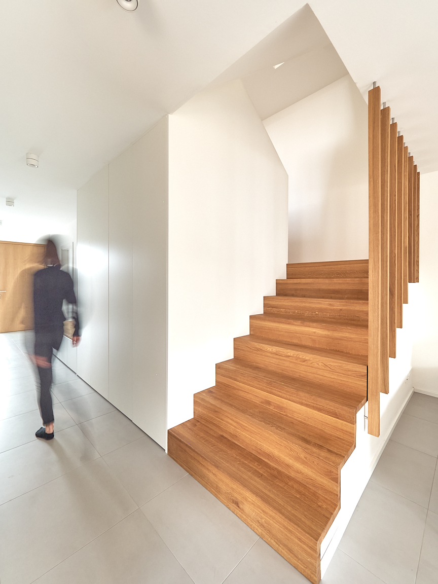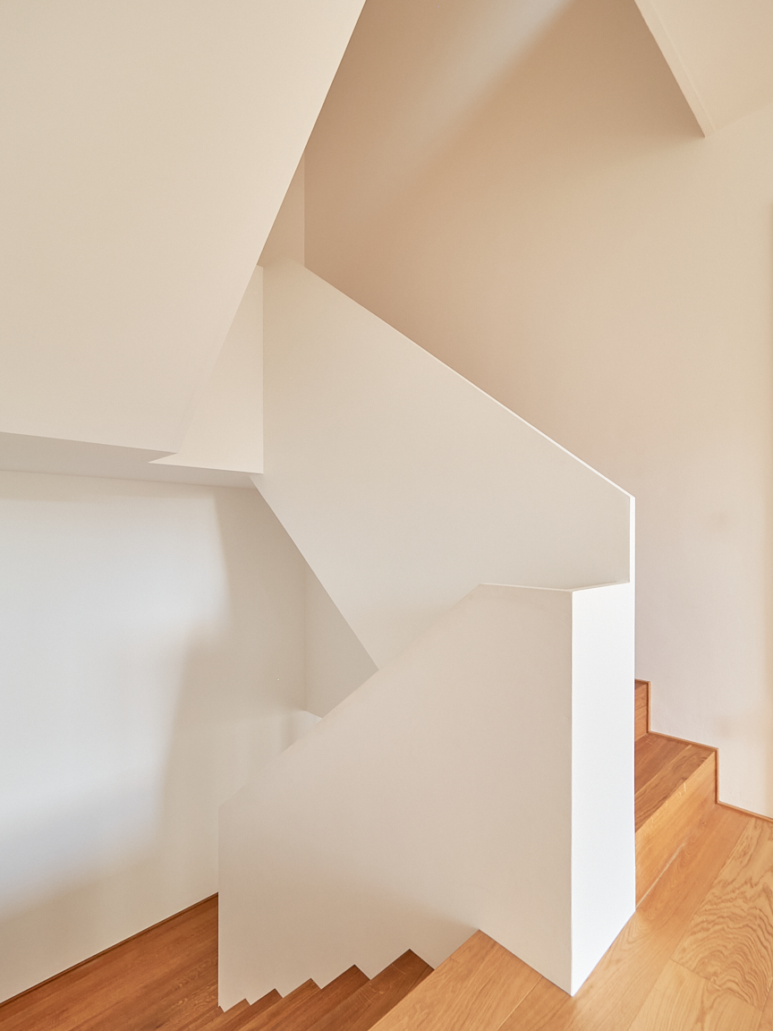 Der Neubau, eingeschossig mit Satteldach, fügt sich in die gebaute Umgebung aus den Neunzigerjahre ein. Das Haus wurde ohne Keller errichtet und dafür bis ins Dach ausgebaut. Die zentrale Treppe über drei Ebenen, bietet durch ein sich nach oben vergrösserndes Treppenauge, Blicke bis ins Dach. Im Erdgeschoss gliedert ein zentraler Kamin den offenen Koch-, Ess- und Wohnbereich. Im OG liegen um einen Spielflur die Schlafzimmer und das Bad. Unter dem Dachspitz ist noch Raum für ein Studio.