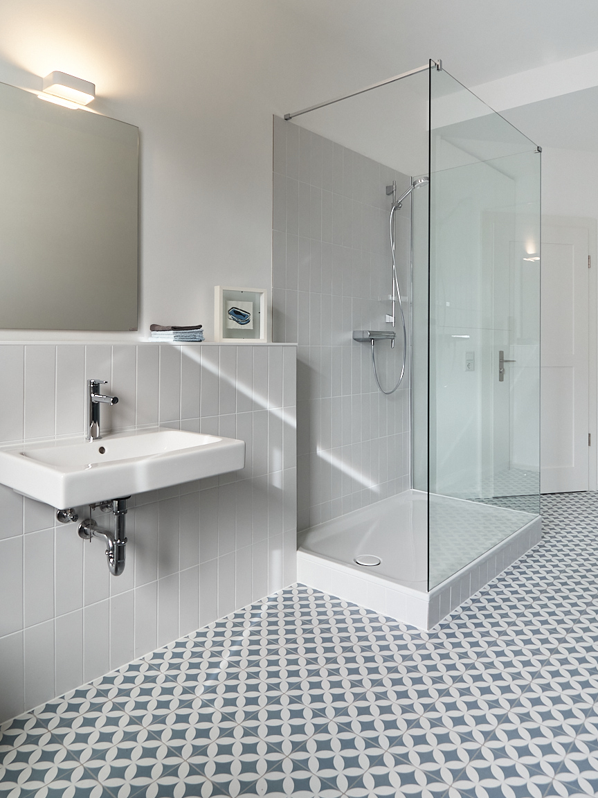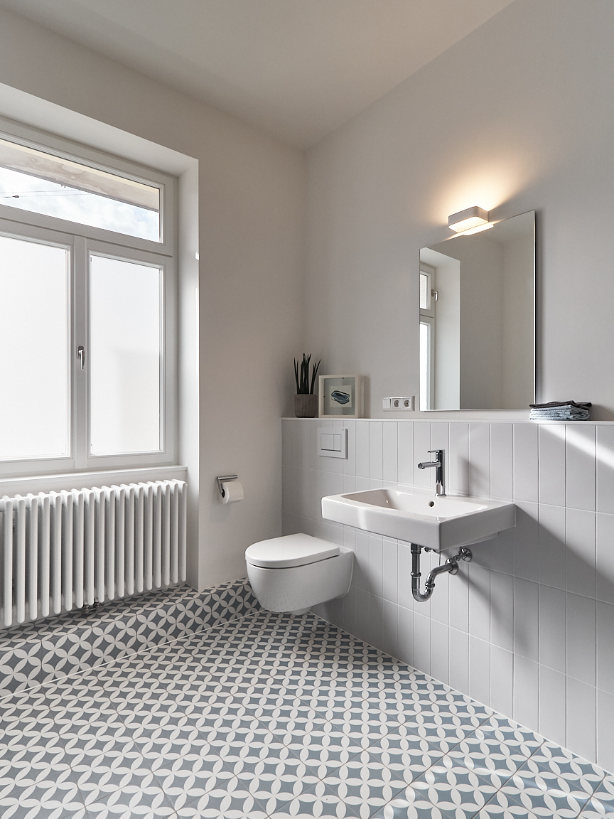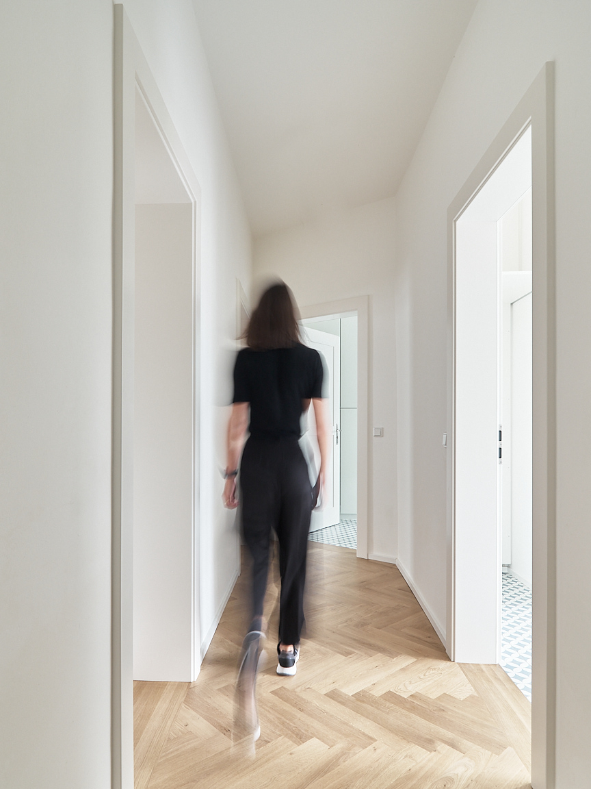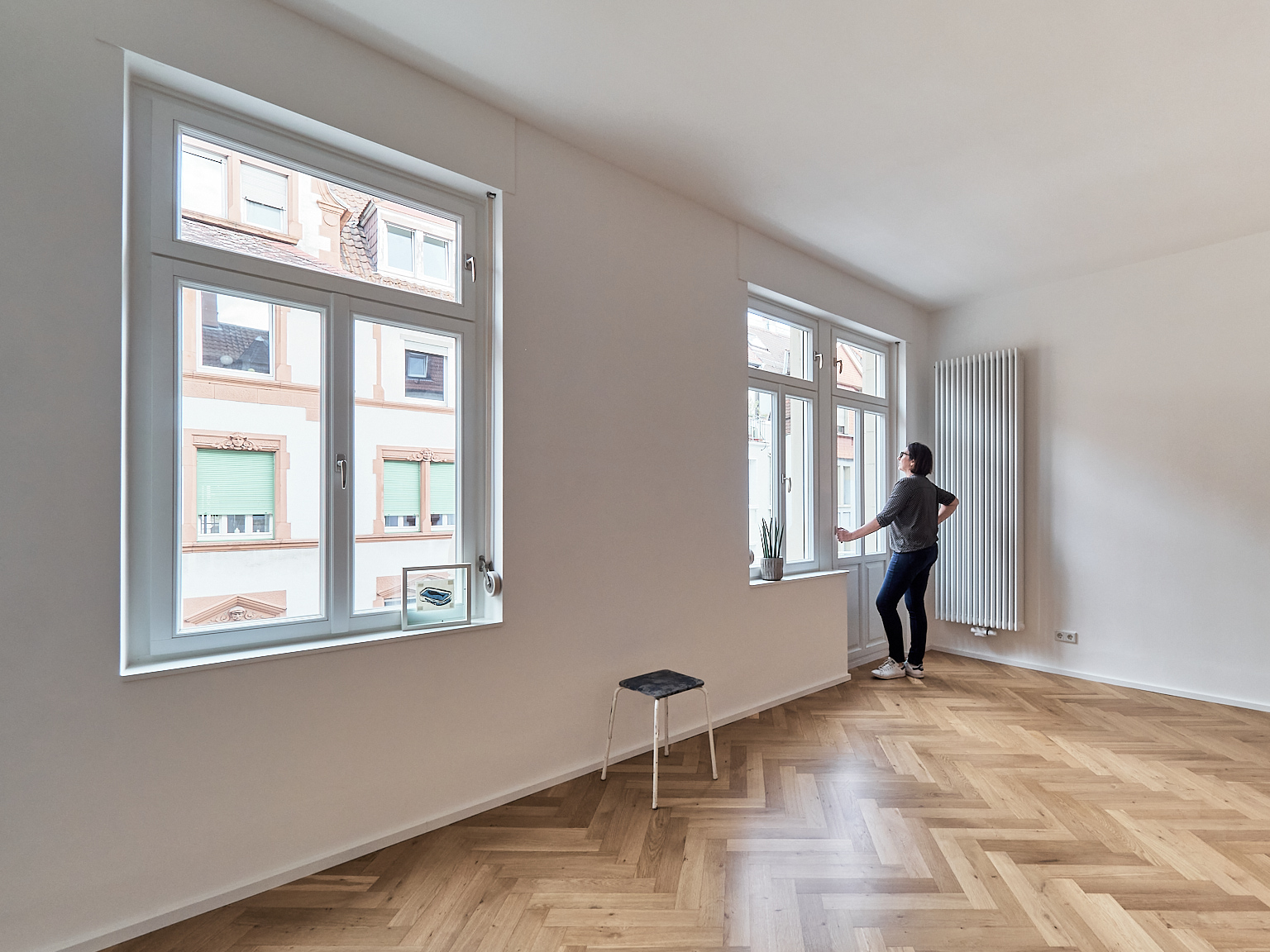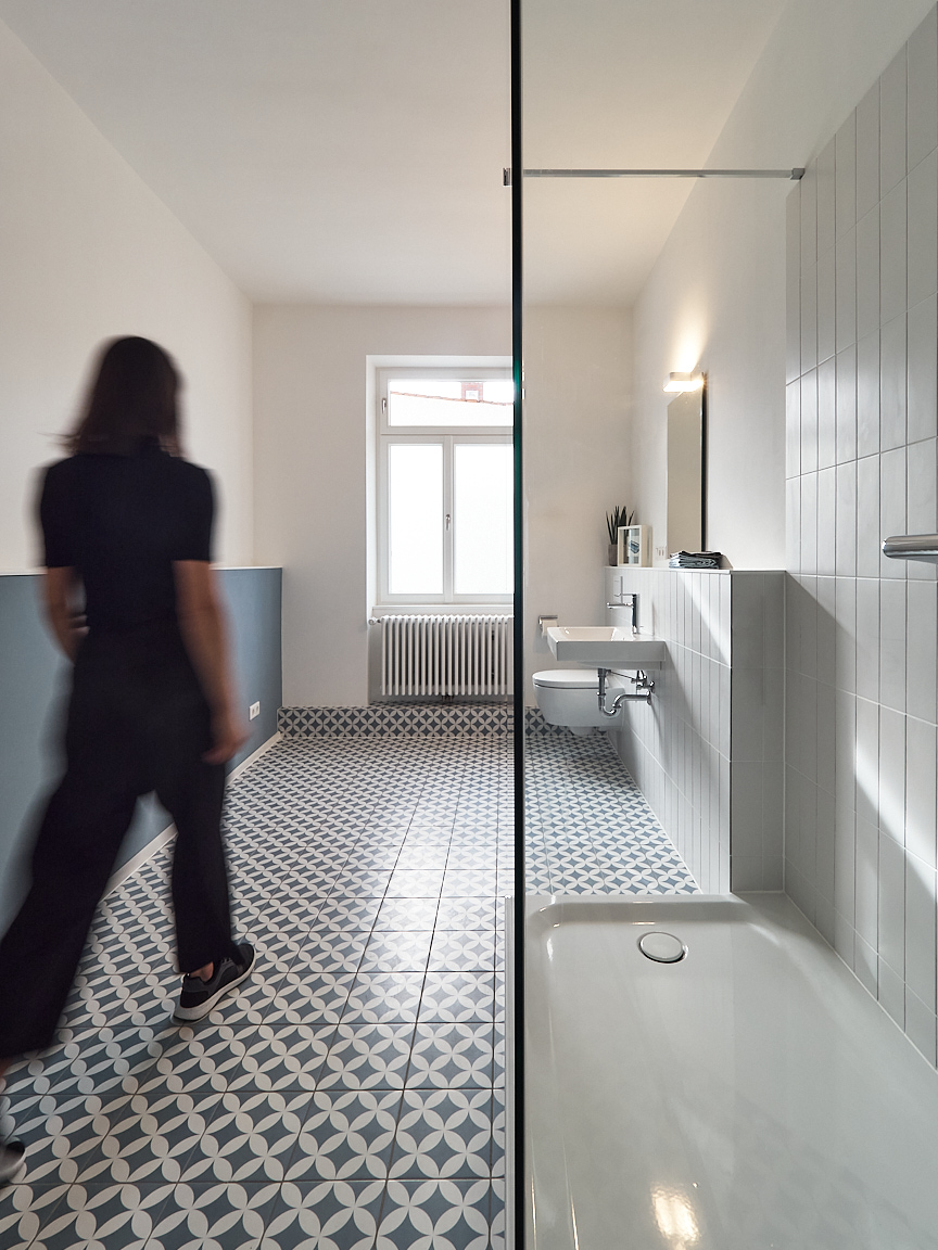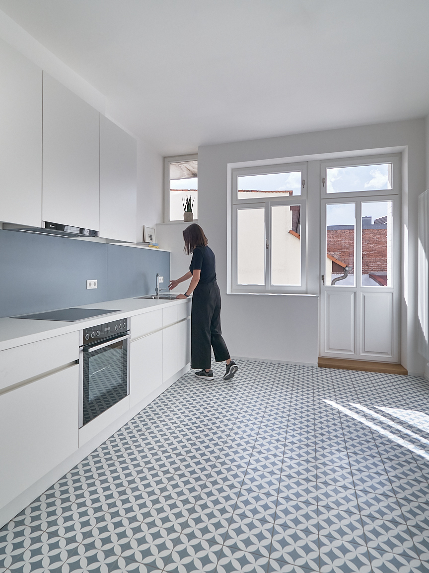 Eine fast noch bauzeitliche 3 Zimmerwohnung, mit Badewanne in der Küche, wurde renoviert und den heutigen Wohnansprüchen angepasst. Durch die Wegnahme einer Wand, konnte die Küche zu einer schönen Wohn-Essküche erweitert werden. Ein Zimmer wurde zu einem Bad umgebaut. Die unter Denkmalschutz stehende Fassade erhielt, dem Vorbild entsprechend neue Fenster. Der blaue Farbton der Bodenfliesen wurde in Form von farbigen Wandflächen in Küche und Bad nochmals aufgenommen. Das vorhandene Parkett wurde aufgearbeitet und im Flur ergänzt.