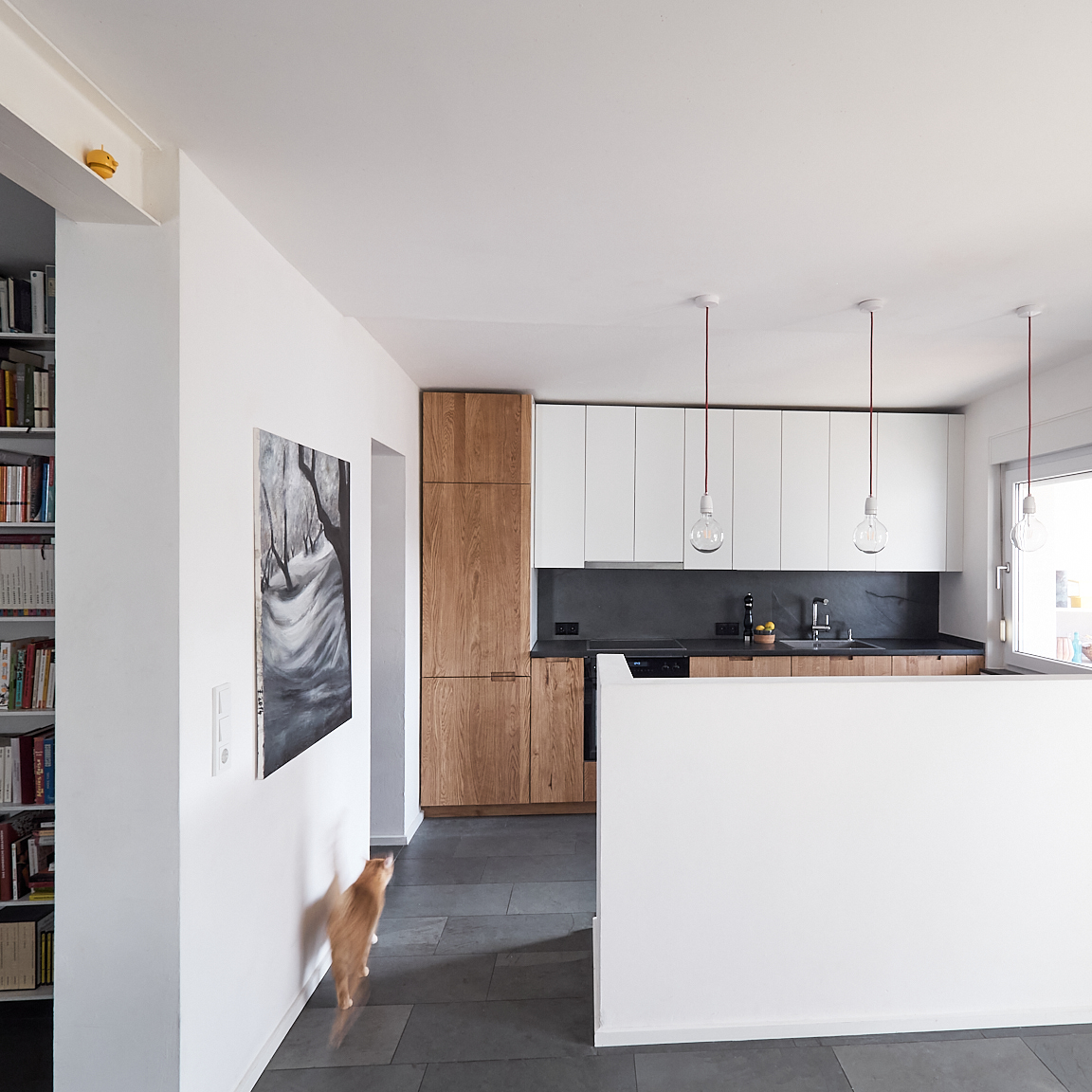 Ein Reihenendhaus aus den 1970er Jahren, mit ursprünglich zwei Wohngeschossen, erhielt Ende der neunziger Jahre eine dritte Wohnung im Dachgeschoss. Aufgabe war, die beiden Wohnungen im OG und DG durch eine neue Treppenlösung zu vereinigen.