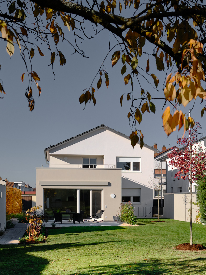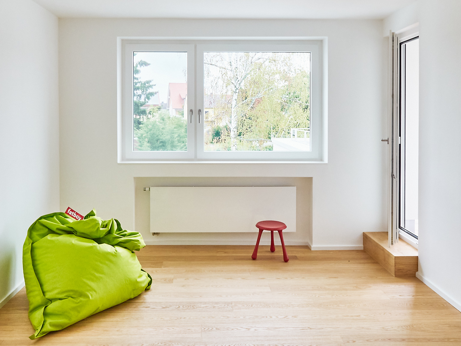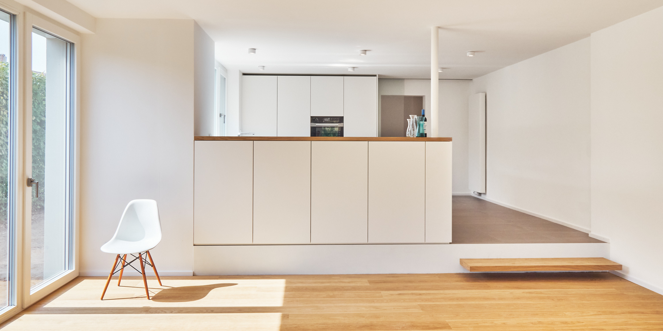 Dem Bestandsgebäude aus den 60er Jahren fehlte ein großer Wohn- und Essbereich. Ein einstöckiger Anbau auf Gartenebene erfüllte diesen Bauherrenwunsch. Die zum Wohnbereich offene Küche, auf erhöhtem Bestands-Niveau, ist die Verbindung zwischen Bestand und Erweiterung. Auf dem Anbau erhielten die Kinder eine Holzterrasse. Der Bestand wurde komplett saniert und energetisch aufgewertet.