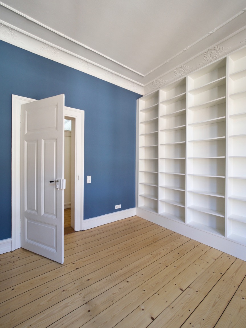 Entstehungszeittypische Elemente wie Sockelleisten und Stuckverzierungen wurden herausgearbeitet, und die neuen Einbaumöbel werden mit farbig abgesetzen Wänden akzentuiert.